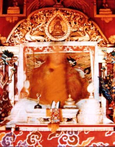 法王本来壮实的身体被移入一个有如电视柜般大小的棺里,棺顶开了一个小窗供人瞻仰。一位来至西方的法师,追随法王多年的Ole'Nydahl喇嘛在透过小窗瞻仰后证实,法王的色身当时只有一个小孩的身躯那么大。