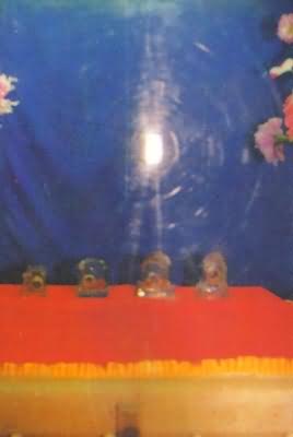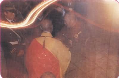1990年三月十九日香港大屿山宝莲寺圣一法师率团到法门寺瞻礼舍利虔诚礼拜,又感舍利放光。该寺方丈澄观法师(正)头顶有光,圣一法师(背)、静一法师身体皆成透明,身后地面的砖纹清晰可见,上空腾起黄、白、红、霞等光线,大众顶礼赞叹。