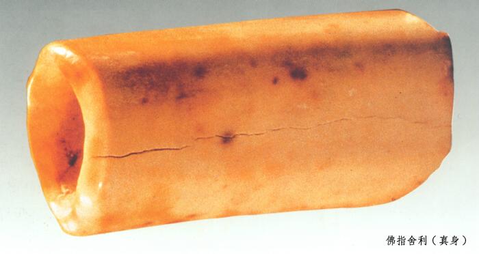 真身佛指舍利(灵骨)亦称“第三枚佛指舍利”,发现于1987年5月10日。因担心在遭遇法难时被毁,此枚舍利被秘藏在地宫后室正面墙根下的泥土中。舍利为五重宝函所包裹。第一重宝函为铁质,出土时已锈迹斑斑,呈深褐色。第二重宝函是一个精美的银质鎏金函,函身雕凿有45尊造像,所以被命名为“四十五尊造像顶函”。函身东侧下方錾刻有“奉皇帝敕造释迦牟尼真身宝函”。第三重宝函是一檀香木函。木质已朽,其顶及函身都有银质雕花包角。第四重宝函是一副水晶椁。椁顶嵌有黄、蓝宝石各一颗。在椁盖上雕着观音菩萨坐像。第五重宝函是一个壶门座玉棺。玉棺放在雕花棺床之上。玉棺之内供奉的舍利就是释迦牟尼佛真身灵骨(为左手中指)。指节其色微黄,有裂纹和斑点。